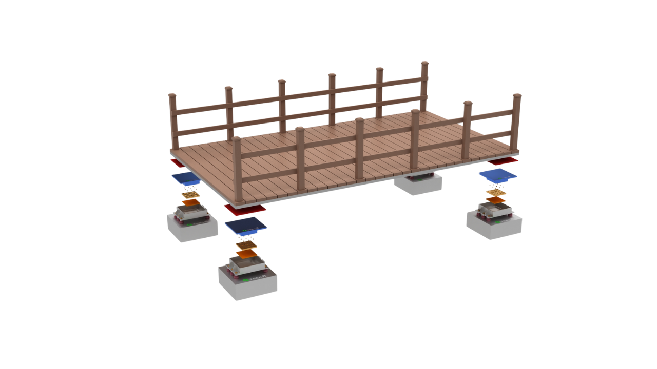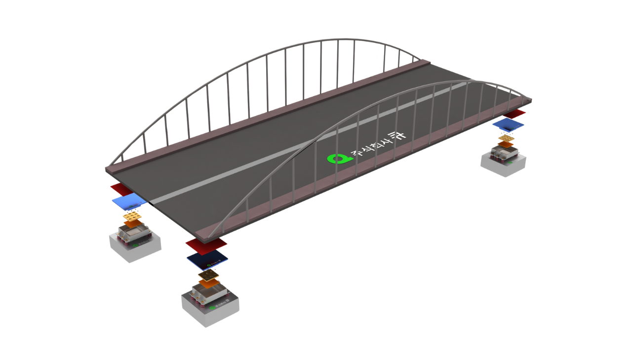 이 면진장치는 교량 하부에 설치되어 지진 시 발생하는 진동을 흡수하고 분산시킵니다. 상부 목교 구조와 하부 기초 사이에서 충격을 완화하여 구조적 안정성을 높입니다.